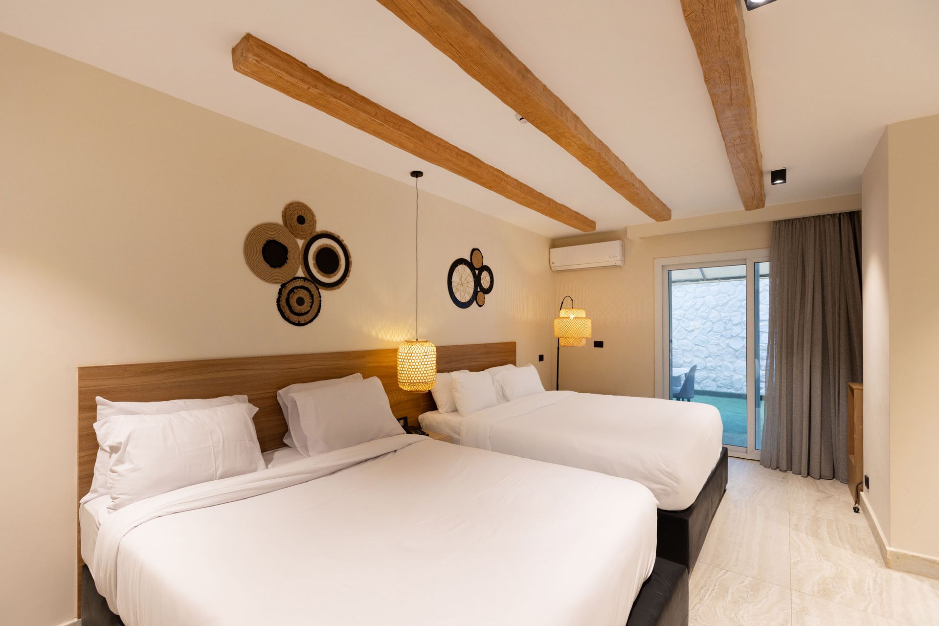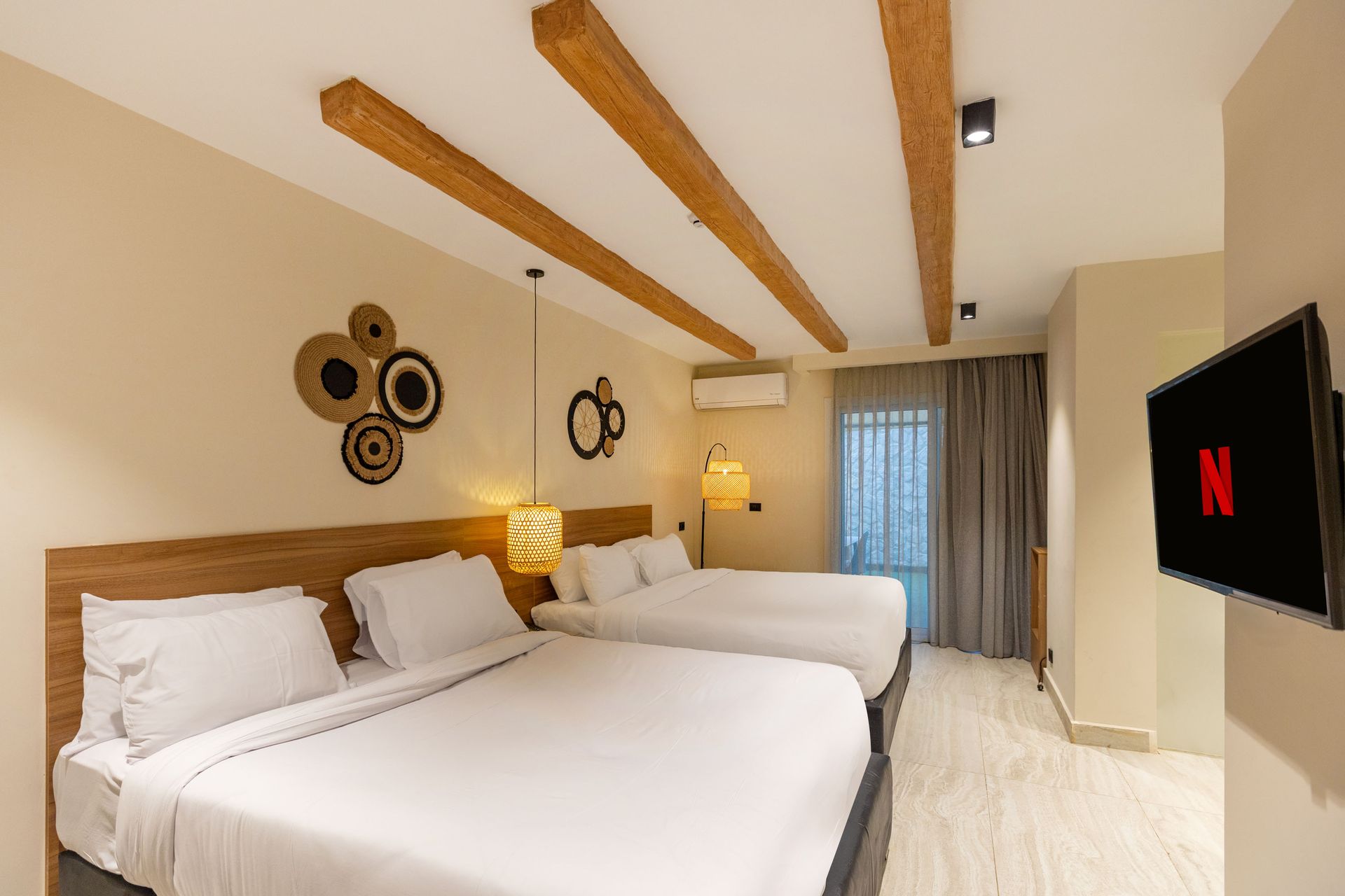 Providing free toiletries, this family room includes a private bathroom with a walk-in shower, a hairdryer and slippers. The air-conditioned family room provides a flat-screen TV, soundproof walls, a minibar, a wardrobe as well as garden views.